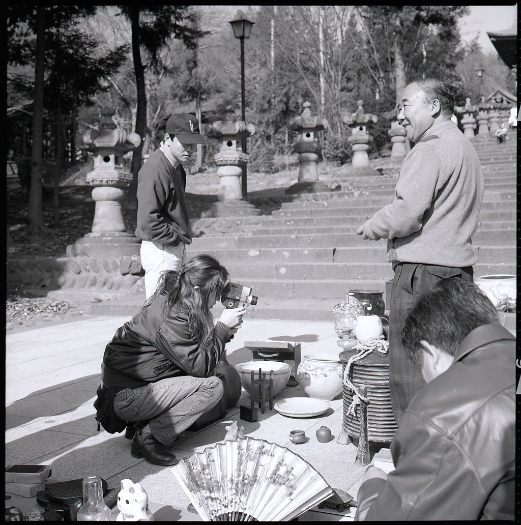 Rolleiflex 2.8F Planar 80/2.8 T-MAX 100 宮町の東照宮では、毎月第4日曜日に門前で青空骨董市が開かれます。 昔なつかしい8mmカメラを手にお姉さん、 「おじさん、これ動くの?」 「おう、電池を入れれば動くよ!」 って、おじさん!、フィルム無いっすから!