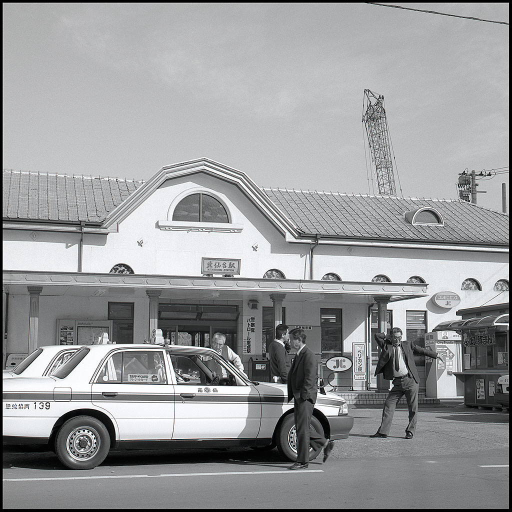 Rolleiflex 2.8F Planar 80/2.8 T-MAX 100 仙山線、北仙台駅はレトロ調の可愛いらしい駅舎。 タクシーのおじさんも腰を伸ばして休憩です。 撮影は'97年頃。 現在では背後に大きなマンションが二つも建っています。 PR